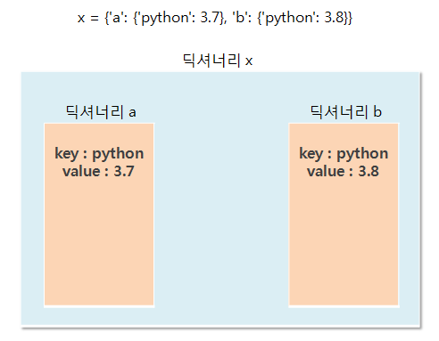 결과 값 : {'a': {'python': 3.7}, 'b': {'python': 3.8}}