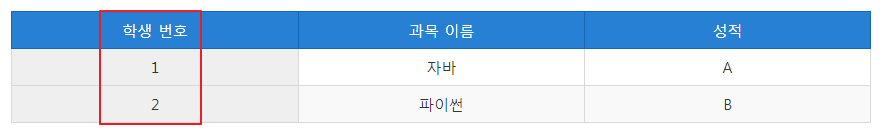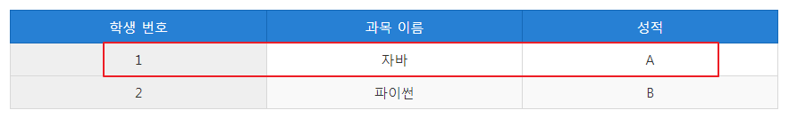 | 학생 번호 | 과목 이름 | 성적 |