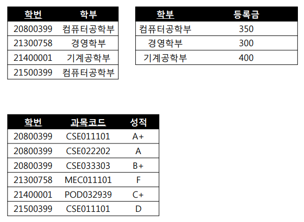 함수(학번, 과목코드)에서 부분 함수인 학번 혼자서 학부와 등록금을 결정할 수 있기 때문에 제2 정규형을 만족할 수 없기 때문에 성적, 학부, 등록금에 모두 영향을 주는 학번을 기준으로 릴레이션을 아래와 같이 분리 시킵니다.