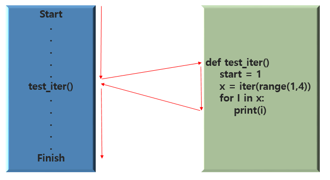 아래는 제너레이터의 실행 흐름 입니다. 빨간색 화살표 → 파란색 화살표 순으로 보시면 됩니다.