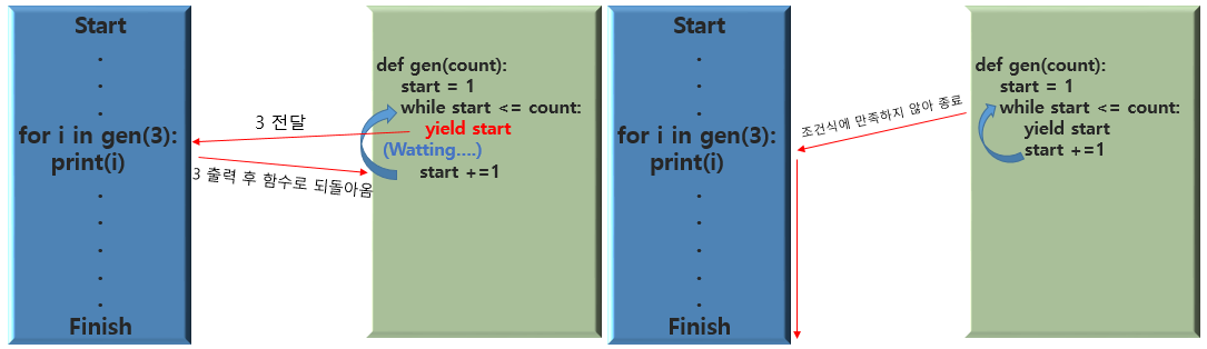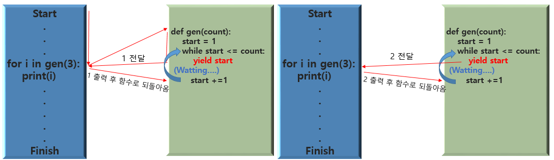 즉, yield를 이용해 값을 함수 밖으로 보내고 대기 상태에 들어간 후 실행 순서를 양보하여 함수 밖의 print(i)가 출력 후 실행 순서가 함수로 다시 되돌아온다는 것을 알 수 있습니다.