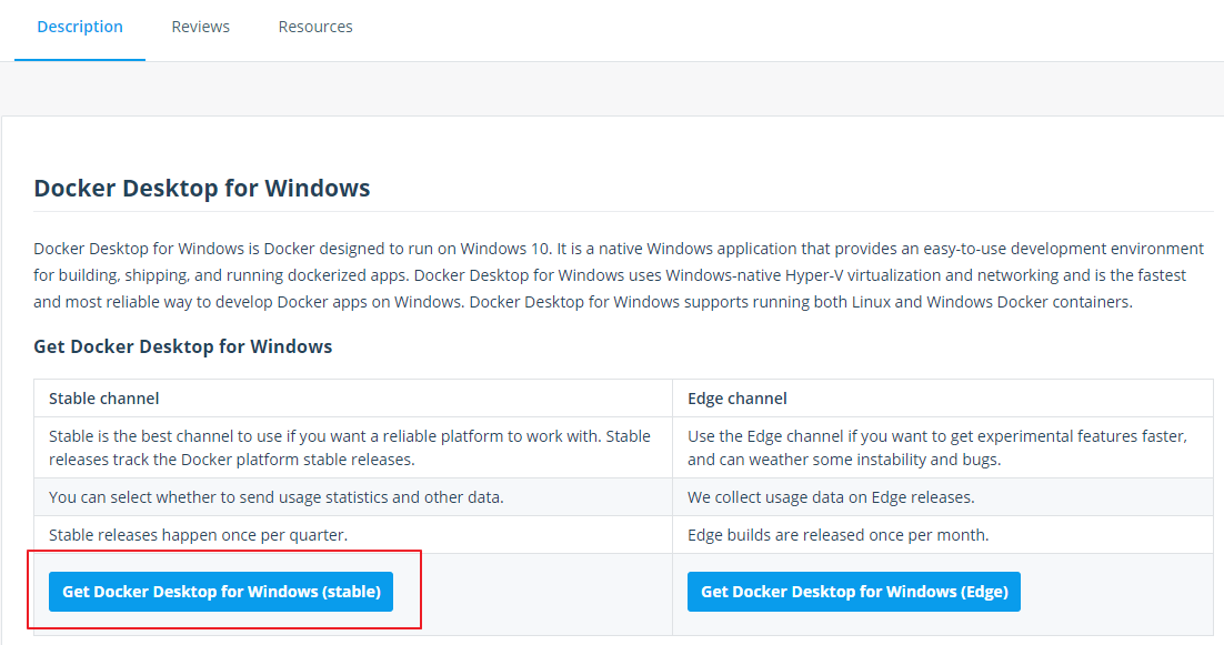 hub docker에 접속하여 도커 데스크탑을 다운로드 받습니다. (https://hub.docker.com/editions/community/docker-ce-desktop-windows) 저는 안정버전인 stable을 다운로드 받겠습니다.
