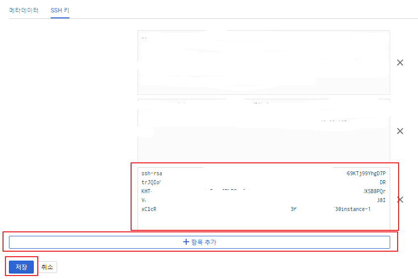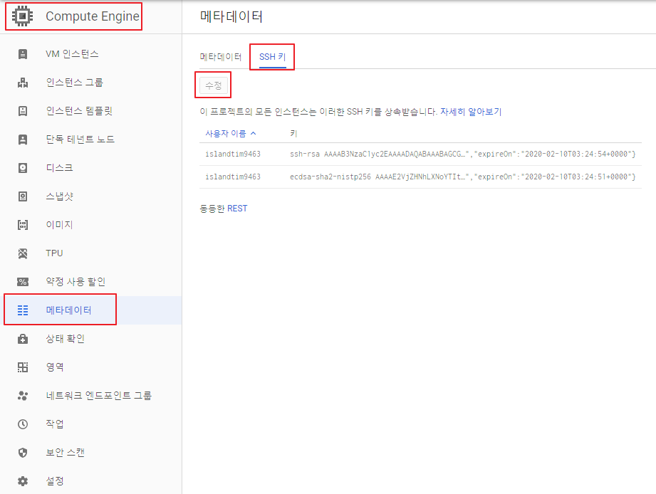 GCE(Google Compute Engine)의 메타데이터를 이용하여 SSH 키를 자동으로 배포해줄 수 있습니다. GCE 에서 메타데이터 → SSH 키 → 수정을 클릭 합니다.