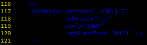 이후 vi /usr/local/tomcat9/conf/server.xml 들어가서 아래 116~121 라인의 주석을 해제 합니다. (tomcat8 까신분들은 /usr/local/tomcat8/conf/server.xml)