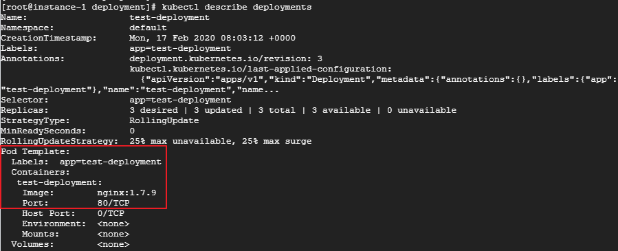 롤백한 후 파드 하나는 종료중이며 새로운 파드 3개가 생성 및 이미지 버전을 1.9.1로 업그레이드 후 비활성화 되었던 레플리카셋(96bc7dbd9)이 다시 활성화 상태로 변경된걸 확인할 수 있습니다. kubectl describe deployments 를 입력해서 자세한 내용을 확인하면 다시 이미지 버전이 1.7.9로 변경된것을 확인할 수 있습니다.