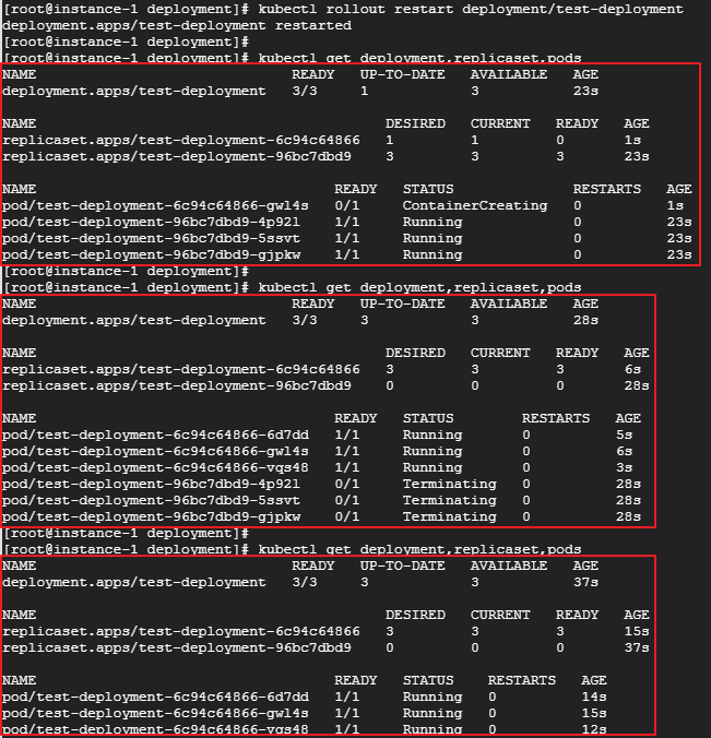 위의 사진은 재시작 후 파드들이 생성/삭제되는 과정 입니다. 디플로이먼트 재시작 시 아래와 같은 과정을 거치는것을 확인할 수 있습니다.