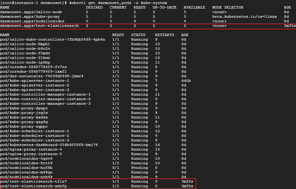 위와같이 실제로 kube-system이란 네임스페이스에 데몬셋이 실행 되었으며 test-elasticsearch라는 파드가 2개 생성된것을 확인 했습니다. (현재 저의 테스트환경이 마스터 3대, 노드 2대이므로 노드 개수에 맞춰 파드가 생성 됩니다.)