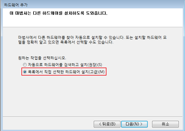 - 다음 → 목록에서 직접 선택한 하드웨어 설치(고급) 체크 후 다음