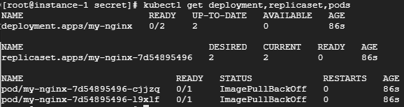 아래 예시는 secret name이 dockersecret으로 되어 있지만, 매니페스트 파일에는 dockersecret2로 저장하였고 그 후 apply 할 때 secret을 참조할 수 없어 이미지를 못가져오고 ImagePullBackOff가 발생합니다.