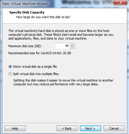 분할 저장(Split virtual disk into multiple files)이 처리 속도가 조금 더 빠르긴 하나 체감상 느껴질 정도는 아니기 때문에, 파일 관리하기가 쉬운 Store virtual disk as a single file 을 선택 하겠습니다.