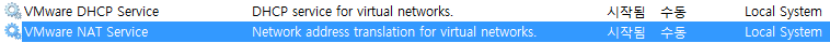 실행중이 아닐 경우 우클릭 후 시작 해주시고, 만약 DHCP를 사용중이라면 VMware DHCP Service도 확인 하시길 바랍니다.