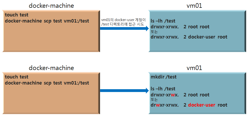 기본적으로 docker-machine은 scp 사용 시 docker-user 계정을 사용하게 되므로, scp를 통해 업로드할 노드(서버)의 경로에 docker-user 계정에 대한 권한을 부여해주어야 합니다.