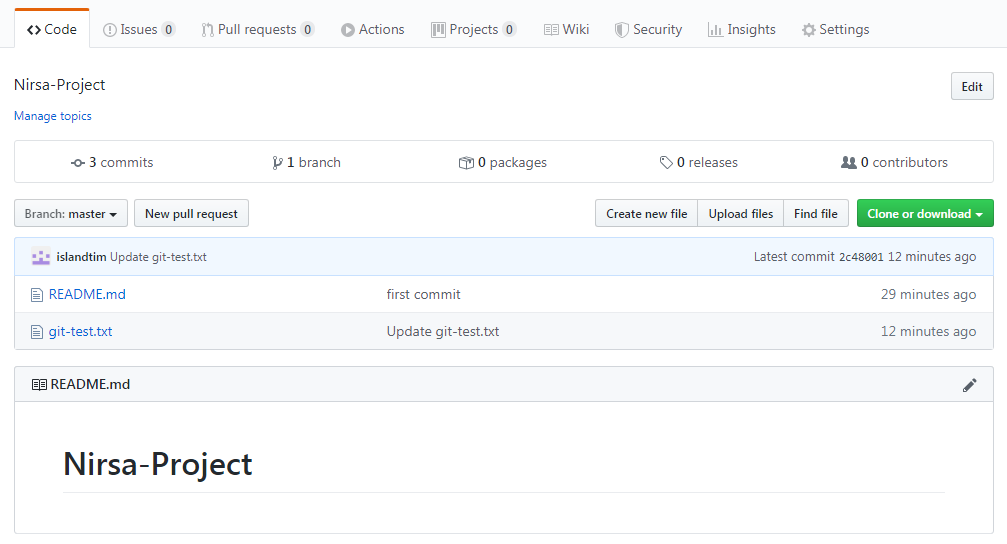 저의 경우 아래와 같이 git clone으로 원본 파일을 가져오고, 누락된 git-test.txt 파일을 작업 디렉토리로 가져온 후 생성된 프로젝트 파일 삭제하여 push에 성공 하였습니다.