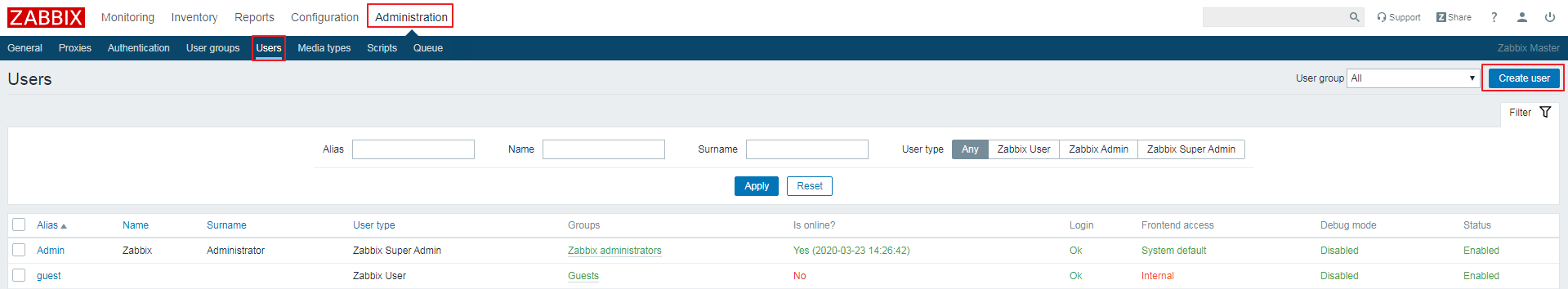 Administration → Users → Create user 를 클릭하여 아래와 같이 유저를 생성 해줍니다.