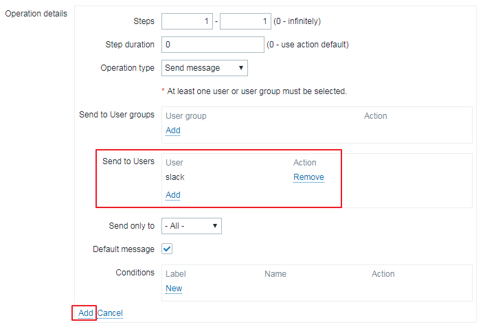Send to Users는 아까 생성했던 slack 계정을 선택한 후 가장 하단의 Add를 눌러서 생성을 완료 합니다.