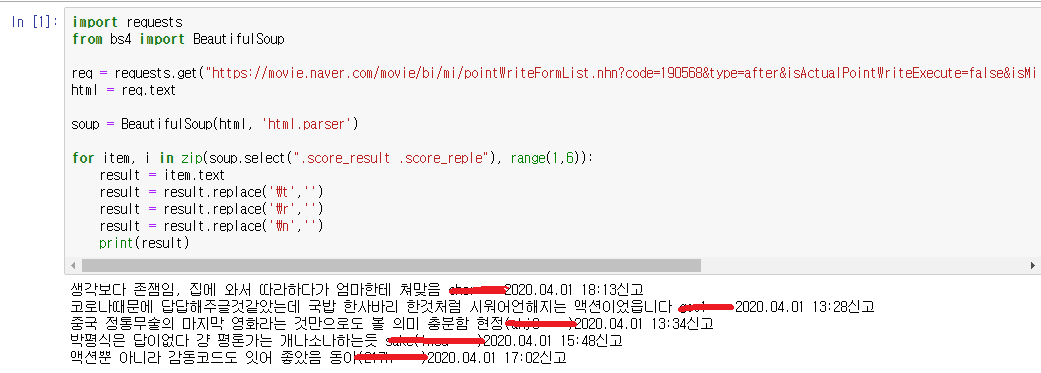 req = requests.get("https://movie.naver.com/movie/bi/mi/pointWriteFormList.nhn?code=190568&type=after&isActualPointWriteExecute=false&isMileageSubscriptionAlready=false&isMileageSubscriptionReject=false&page=1")