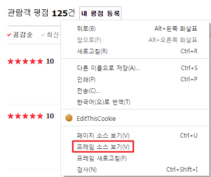 크롬의 경우 아래와 같이 간단히 주소를 구할 수 있는데, 평점에서 우클릭하여 프레임 소스 보기를 선택 합니다.