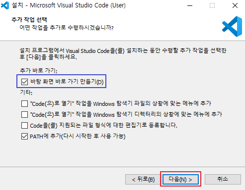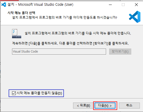 - 4. 시작 메뉴를 설정 합니다. 저같은 경우 필요 없기에 시작 메뉴 폴더는 만들지 않도록 파란색 박스에 체크 했습니다.