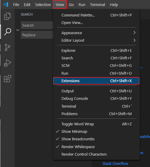 - Visual Studio Code의 상단 View → Extensions 클릭