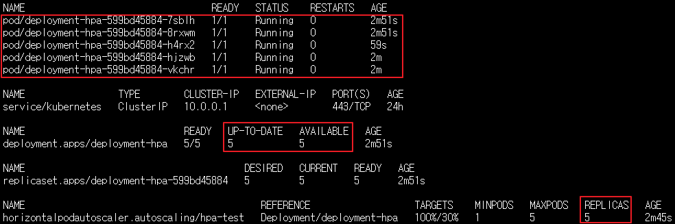 deployment-hpa에서 CPU 사용률 부하가 발생하며 아래와 같이 HPA로 인해 자동으로 스케일 아웃된것을 확인할 수 있었습니다. HPA 매니페스트 파일에 maxReplicas: 5를 설정 했으므로 최대 5개까지 증가 되었습니다.