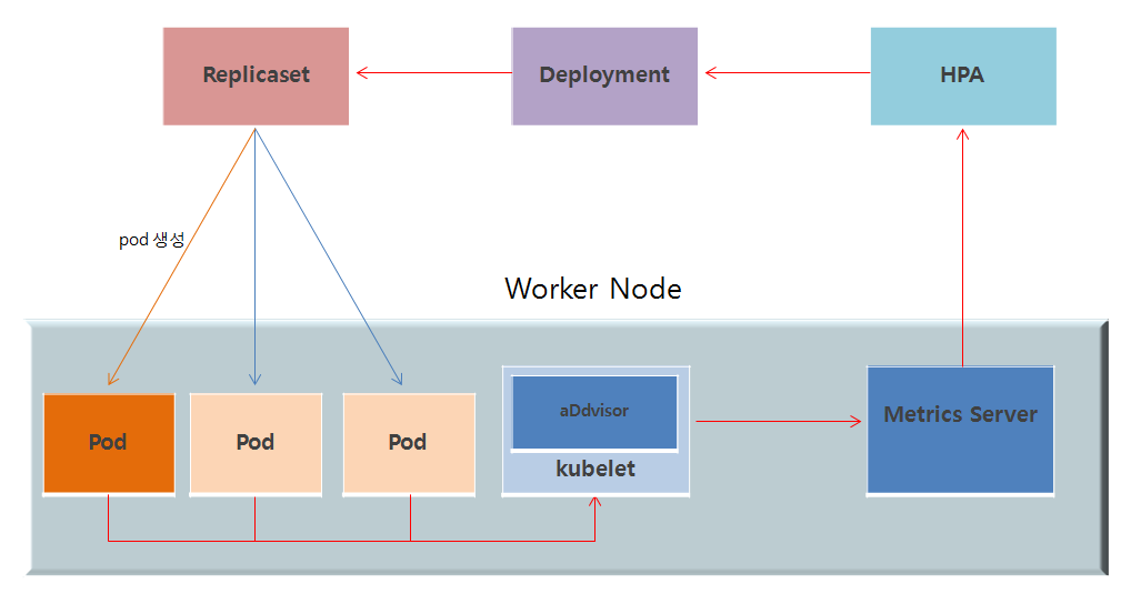 위와 같은 과정을 통해 replicaset을 배포하고, 모든 Pod의 사용률 총합을 구한 뒤 HPA 매니페스트 파일에 지정한 사용률을 나눠 배포할 replicas 개수를 구합니다.