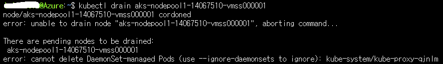 * 참고로 --ignore-daemonsets 옵션을 추가해주지 않고 drain을 사용하게 되면 아래와 같이 에러가 발생 합니다. daemonsets은 각 노드들에 하나씩 실행되기 때문에 다른 노드로 옮기수가 없어 발생하는 에러 입니다.
