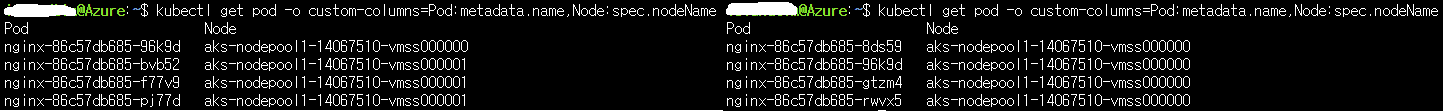 - kubectl get pod -o custom-columns=Pod:metadata.name,Node:spec.nodeName : Pod가 배치된 노드 확인