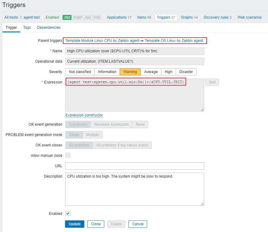 아래 이미지를 보면 Template Module Linux CPU by Zabbix agent라는 템플릿에서 CPU Utilization에 대한 트리거를 불러오는것을 확인할 수 있고 {$CPU.UTIL.CRIT} 라는 변수(임계치)가 특정 구간을 넘어서고 5m (5분) 이상이 지속될 경우 알람이 발생하도록 설정되어 있는것을 확인할 수 있습니다.