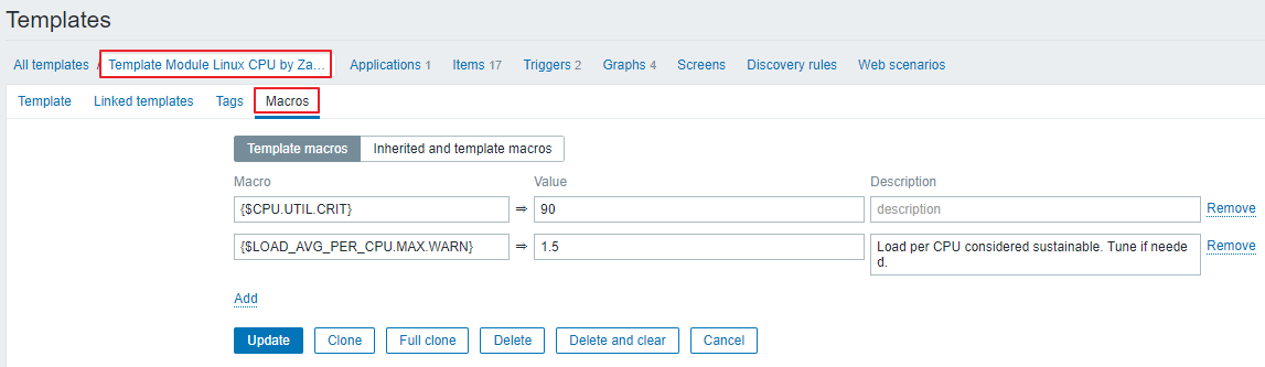 Template Module Linux CPU by Zabbix agent 템플릿을 찾아 들어가서 Macros를 보면 {$CPU.UTIL.CRIT} 라는것에 90이라는 값이 들어가있는것을 확인할 수 있고, 이로써 CPU 사용률이 90%이상 5분이상 지속될 경우 알람이 발생되도록 설정된것을 볼 수 있습니다.