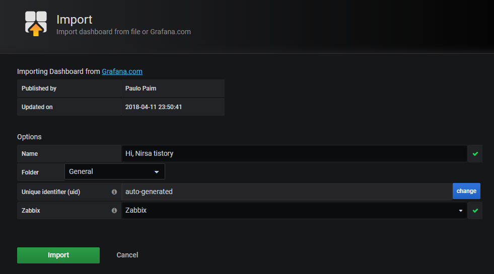 아래와 같이 대쉬보드 이름 등을 설정하여 Import를 눌러주시면 완료 됩니다.