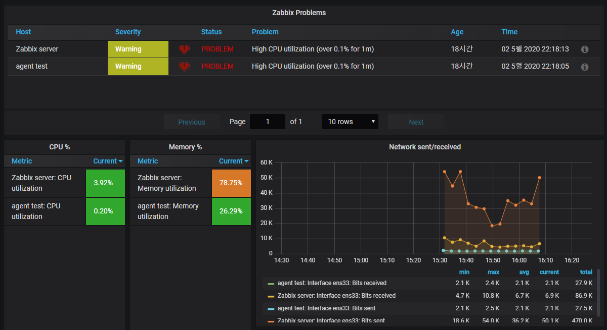 자빅스와 같은 모니터링 오픈소스 툴과 연동하여 사용할 경우 아래와 같이 대쉬보드를 구성하여 모니터링할 수 있습니다. (아래 화면은 저가 구성한 대쉬보드이고, 그라파나 홈페이지를 통해 더 이쁜 대쉬보드 템플릿들을 사용할 수 있습니다.)
