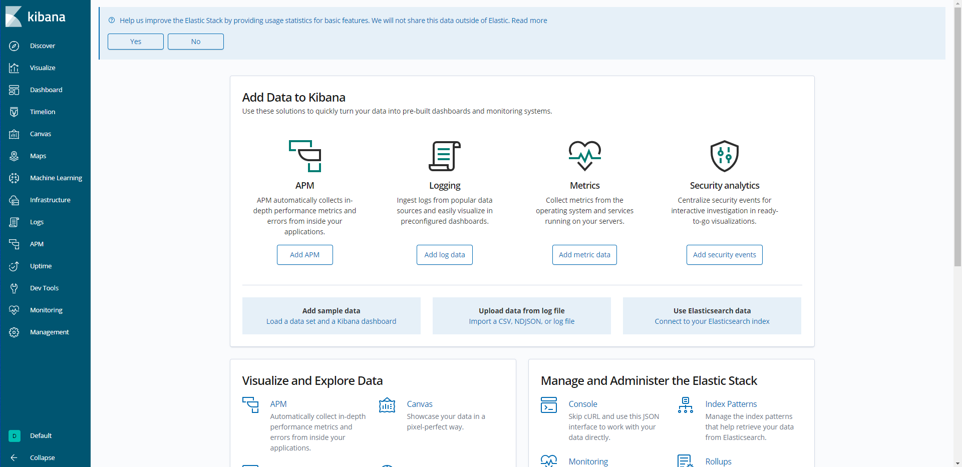 브라우저를 통해 http://서버IP:5601으로 접속 시 아래와 같은 화면이 나오면 정상적으로 설치된 것 입니다.