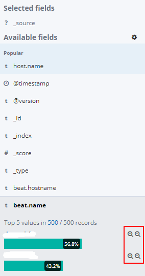 좌측 매뉴에서 Discover를 누르면 아래와 같은 화면이 나타 납니다. beat.name은 filebeat을 설치한 호스트 명을 나타내는데, 여기서 보고싶은 서버의 우측 조그만한 + 모양의 돋보기를 클릭하시면 해당 서버의 로그만 확인할 수 있습니다.