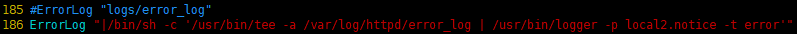 ErrorLog "|/bin/sh -c '/usr/bin/tee -a /var/log/httpd/error_log | /usr/bin/logger -p local2.notice -t error'"