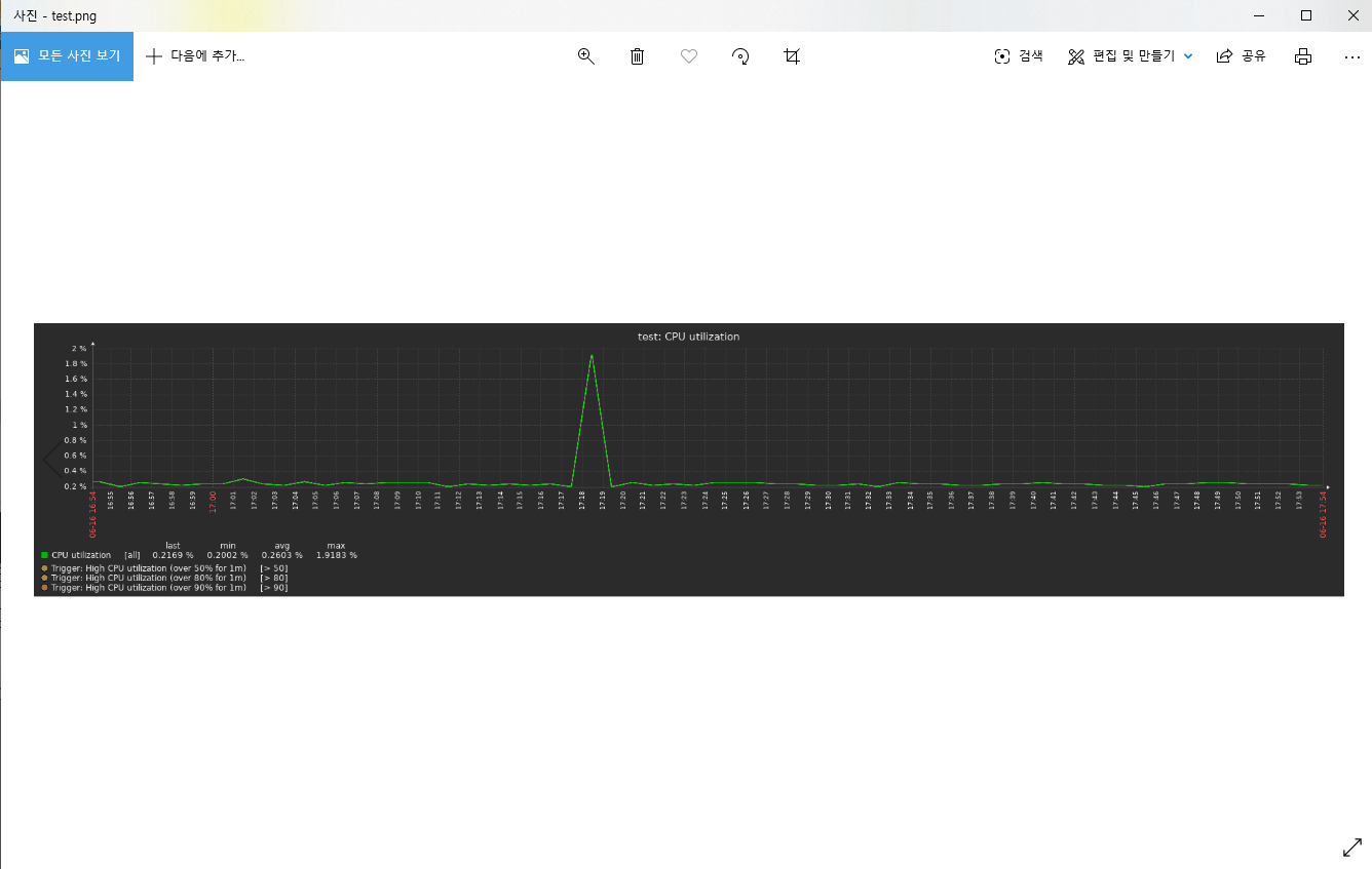 - 1) 얻고자 하는 그래프로 이동 합니다. 저는 test 호스트의 CPU 사용률을 기준으로 작성 하겠습니다.