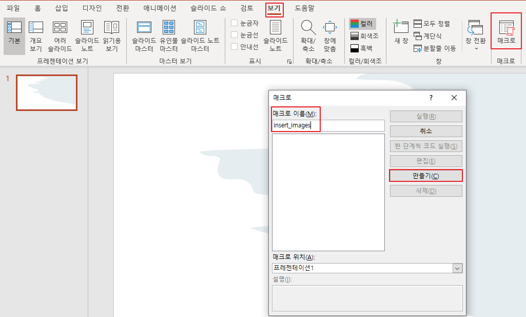 - insert_images는 매크로의 이름으로 저장하여 주시고, (4) 부분은 몇번 슬라이드에 이미지를 넣을것인지에 대한 값 입니다. 저는 첫번째 슬라이드에 넣을것이므로 이후 1로 수정 했습니다.
