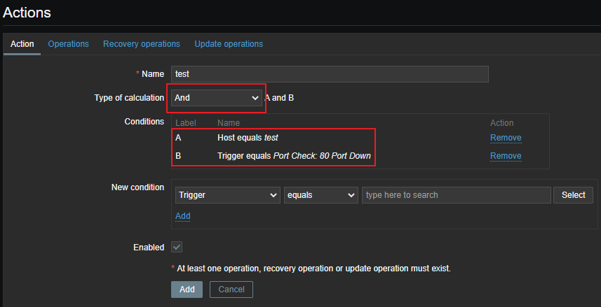 저의 경우 test라는 호스트에서 80 포트 다운이 발생할 경우 이 액션이 동작하도록 설정 하겠습니다. 두개의 Conditions가 모두 참일 때 동작해야 하므로 Type of calculation은 AND를 선택 합니다. 이 부분은 본인의 환경과 목적에 맞게 설정해주시면 됩니다.