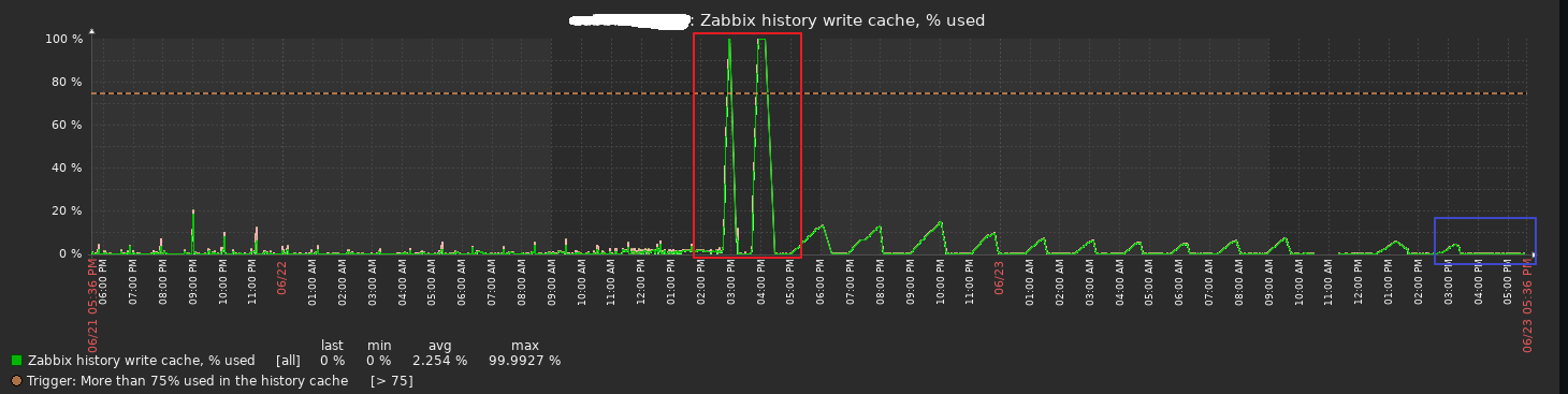 성능 튜닝 및 mysql partitioning을 진행하게된 계기는 자빅스 서버 구축 후 history write cache, history syncer 프로세스가 증가하며 housekeeper가 실행되고, disk i/o 증가로 인해 자빅스 자체가 느려지면서 30분 단위로 발생/정상화되는 현상이 발생 하였습니다.