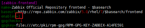 이후 vi 편집기를 이용해 /etc/yum.repos.d/zabbix.repo를 열어준 후 [zabbix-frontend] 밑의 enabled를 0에서 1로 변경 해주고 설치를 다시 진행 합니다.