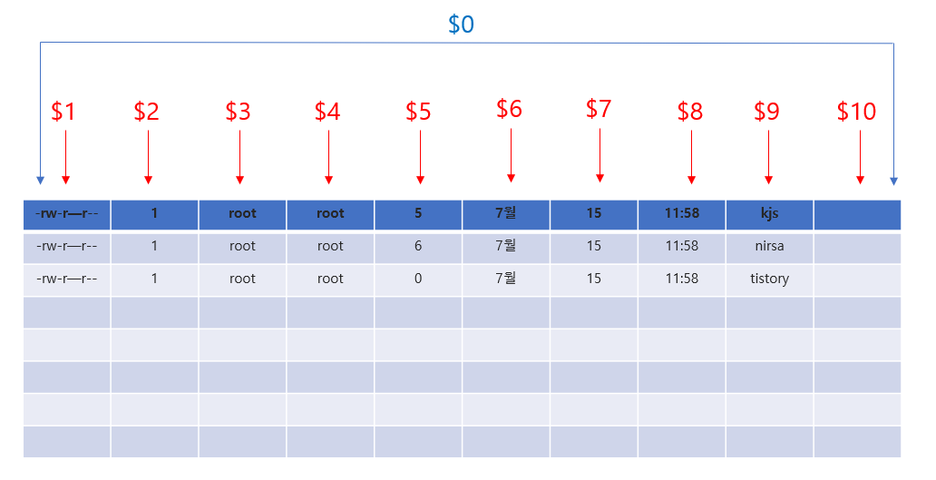 첫번째 필드는 $1, 두번째 필드는 $2와 같이 표현되며 $0은 전체 필드를 가르킵니다. 아래와 같은 리스트가 있을 경우 -rw-r--r-- 은 $1 그 다음의 1로 표시된것(Link Count)은 $2가 됩니다.