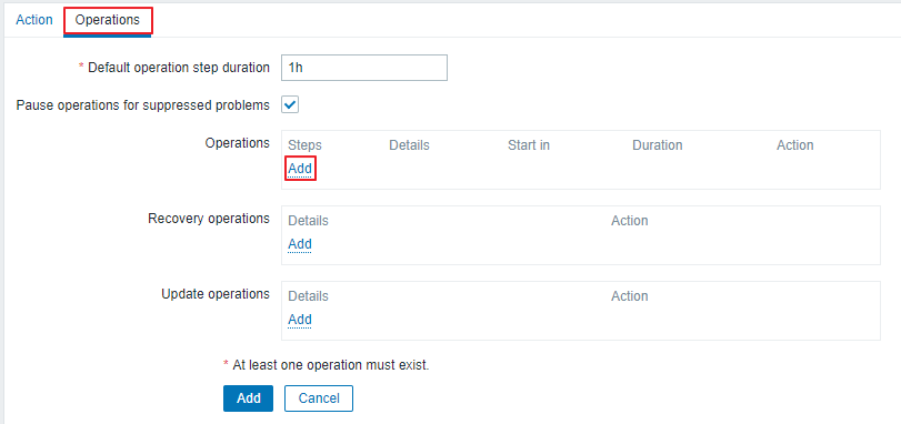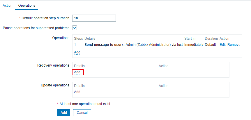 이번엔 Recovery operations 필드의 Add를 클릭 합니다. 이 필드는 알람 정상화 설정 입니다.
