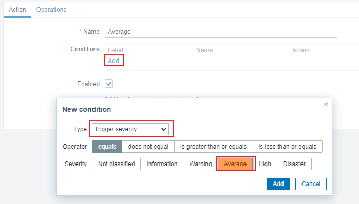 기존에 저가 사용중이던 Action을 Average 등급만 알람을 수신한다고 예를 들자면 아래와 같이 Trigger sverity를 Average equals일때만 받도록 설정 해주어야 합니다.