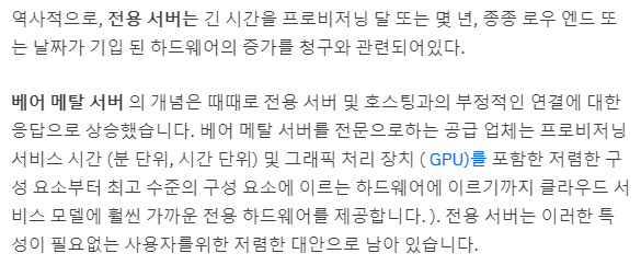베어 메탈 서버는 쉽게 설명하자면 VM이 아닌 물리 서버가 그대로 할당되는 개념의 서비스 입니다. DB 등과 같이 보안상 데이터를 공유하는 환경에서 사용하기가 꺼려지거나, 좀 더 물리서버의 성능을 완벽히 사용하고 싶을 때 베어 메탈 서비스를 이용할 수 있습니다.