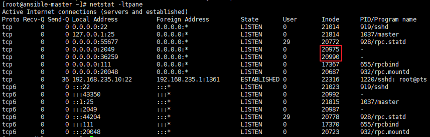 해당 명령의 경우 소켓이 프로세스가 아닌 커널에 속하는것을 확인하는 것인데, 아까 확인했던 nfs(2049)와 현재 찾고자하는 36259 포트가 확인 되었습니다.