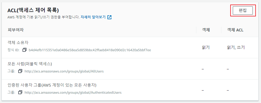 - 2-6) 2-4에서와 같이 객체의 이름을 클릭 후 드래그를 조금 내리다보면 아래와 같이 ACL 정책을 설정할 수 있는 필드가 있습니다. 편집을 누른 후 퍼블릭 액세스에 읽기 권한을 부여해주고 하단의 "변경 사항 저장"을 클릭하여 설정을 저장 해주세요.
