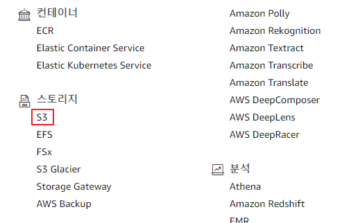 - 1-1) AWS 콘솔 로그인을 하여 AWS Management Console의 스토리지 → S3를 클릭 합니다.