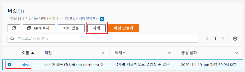 - 3-2) 3-1에서 객체를 모두 삭제 했다면, 버킷으로 돌아와 삭제할 S3 버킷을 선택 후 삭제를 눌러 진행 해줍니다.