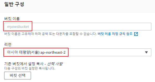 - 1-3) 버킷의 이름과 리전을 선택할 수 있습니다. 버킷 이름을 작성 하고, 리전은 초기 설정으로 진행 하겠습니다.