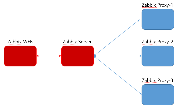- 또는 아래와 같이 Zabbix Proxy 서버와 Zabbix Server, Zabbix WEB 서버를 모두 나눠 관리할 수도 있습니다. Zabbix Server는 수집된 데이터 관리, Zabbix WEB 서버는 Zabbix Server에 있는 데이터를 기반으로 자빅스 대쉬보드를 통해 출력 합니다.