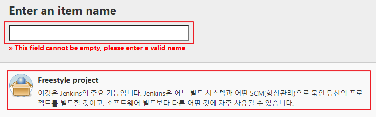 jenkins 웹페이지로 돌아와 좌측의 새로운 item 메뉴를 누른 후 아래 빨간 박스 입력 및 체크 해주세요. 이름은 임의로 작성하시면 됩니다.
